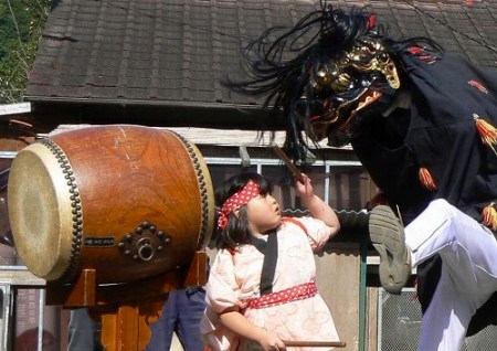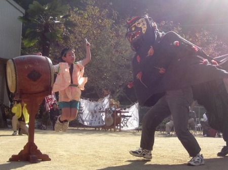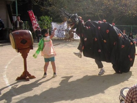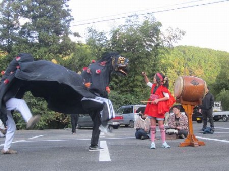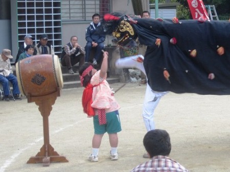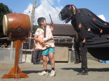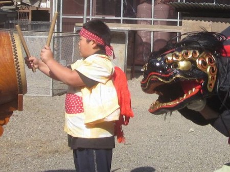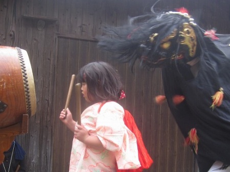 | 10分ほどで山崎神社に到着。 | 山崎神社前での獅子舞。まずは、小学校2年生になったSちゃん。 |