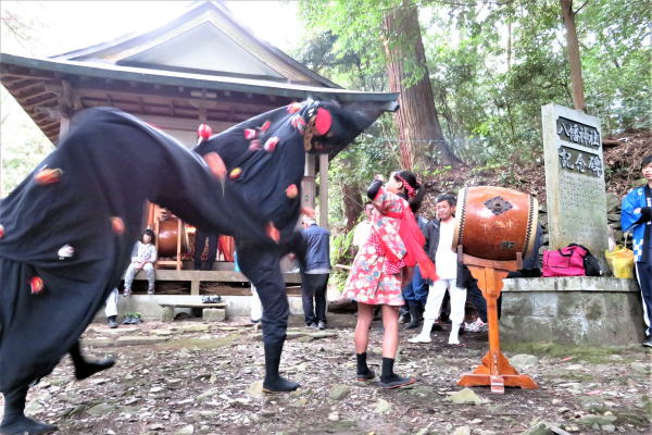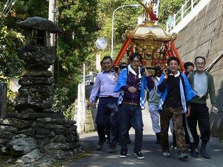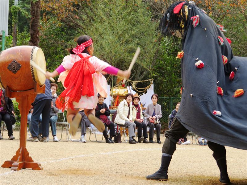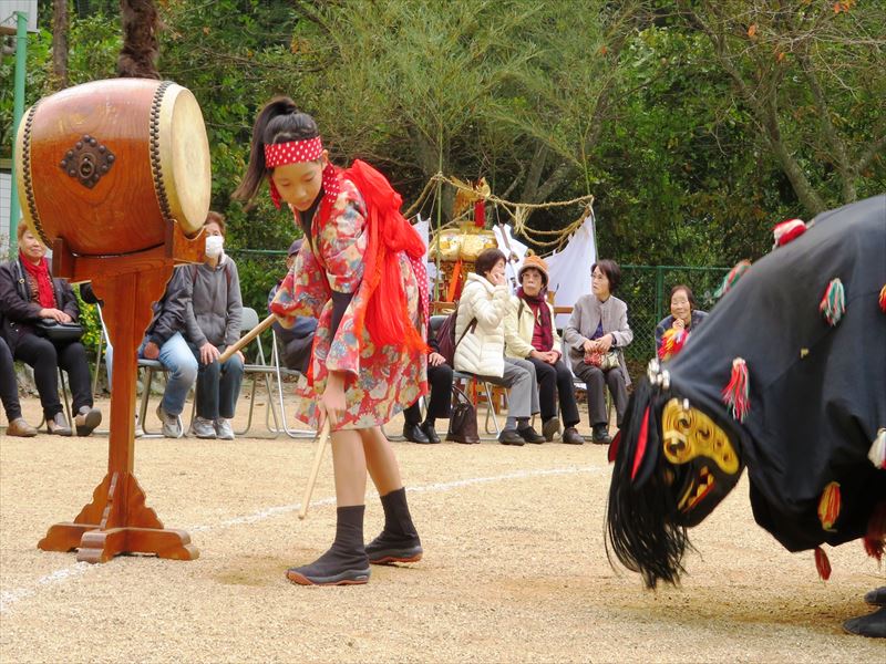 | 荒川の獅子舞は、西条市荒川2号(下分(しもぶん)・東宮(とうぐう)・河ケ平上(こがなるかみ)・河ケ平下(こがなるしも))の氏子でまつる八幡神社の秋の大祭に、神輿のお供をして、お旅所での神事のあと悪魔払いをつとめて舞う獅子舞です。 明治34年、神輿を新造する際に獅子頭を購入し、獅子舞を始めました。舞い方は、隣村の黒瀬(くろせ)から酒井(栄)友吉氏他1名の方が山越えをしてきて、 泊りがけで伝授されました。その当時の若者は、「めかご」を獅子頭にみなして練習を積み、誰もが使い手であり囃子手でありました。 最初は、この獅子頭の購入に5円以上を寄付してくれた人の家をまわっていましたが、大正期になりお旅所で舞う習わしとなりました。戦時中は、息子の、兄弟の、友達の武運長久を願って舞いました。獅子舞を始めた当初は、子どももたくさんいて、太鼓をたたく「なぶりこ」は、8歳になると習えたと聞いております。 昭和48年頃、後継者がいなくなり存続が危ぶまれましたが、加茂公民館が中心となり、「獅子舞保存会」を結成し、後継者の育成を行いました。その後、何度か存続の危機もありましたが、その都度頑張って獅子舞を続けることができました。 しかし、平成30年になり氏子の中に「なぶりこ」を演じる後継者がいなくなり、「荒川の獅子舞」は、最大の危機を迎える事態となりました。 どうすればこの危機を乗り越えられるか思案している頃、縁があって地域外の子どもたちの協力を得ることができることとなり、再び危機を乗り越えることができ、現在に至っています。 荒川の獅子舞は、激しい舞いが特徴で、わずか3分半の舞いの中で、獅子は荒れ狂ったり驚いたりさまざまな表情を見せます。舞の中では、「なぶりこ」がどうもうな獅子を退治するさまを演じていて、獅子を世の中のわざわいにたとえ、世の中のわざわいを取り払う縁起の良い獅子舞と言われています。 八幡神社の秋の大祭は、毎年11月3日に行われています。 |