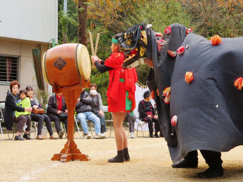 を一日かけてまわり、夕方再び神社に帰ってきます。 【獅子舞の道具】 獅子舞を演じるときの道具は、大太鼓、太鼓台、締太鼓、締太鼓台、 獅子頭、かね、バチ、それとなぶりこの衣裳、ハッピなどです。