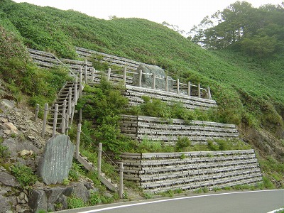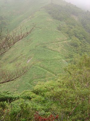 | 少し登ったところから振り返ると、瓶ヶ森に登るジグザクの道が見えた。 |