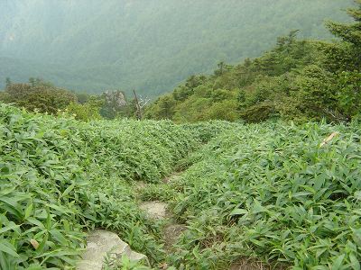| 30分ほど休憩をした後下山をはじめる。先ほど登ってきた急坂を滑りやすいので慎重に降りた。 |