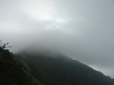 | 東を見ると、雲の向こう側に太陽が昇っている。伊予富士、東黒森、自念子ノ頭の山々が見える。 |