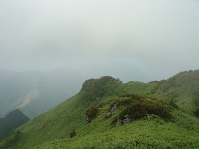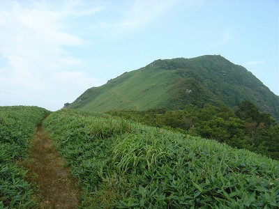 登山道から見た西黒森。多少ガスが少なくなってきて頂上が見えてきた。 |