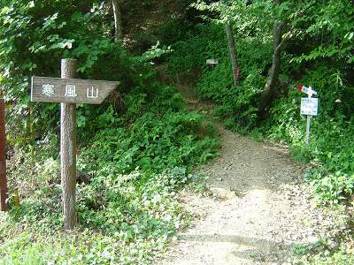 登りはじめて40分で桑瀬峠に到着した。ここで小休止。めざす寒風山はやはりガスの中にあった。 |