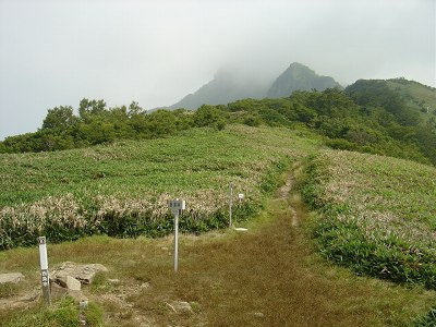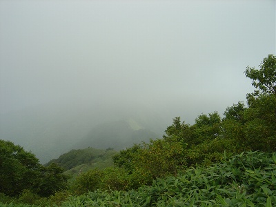 | 山頂から笹ヶ峰の方を見てみた。ガスがかかってなにも見ることはできない。 |