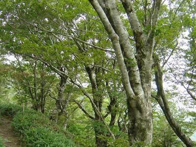 | ブナの並木が続く登山道は涼しくてとても快適だ。 |