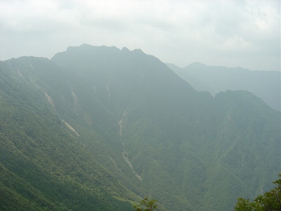30分ほど休憩して、下山をはじめる。ガスが晴れて伊予富士が見えてきた。この山の中腹に今年の冬に行った旧基安鉱山の採掘口がある。 |