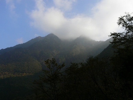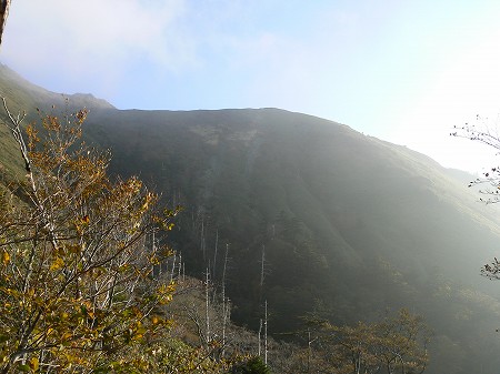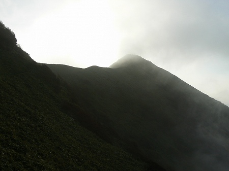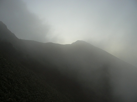 いい天気と思ったのだが・・・山頂から黒いガスが下りてきた。むむっ、こんなはずでは・・。 |