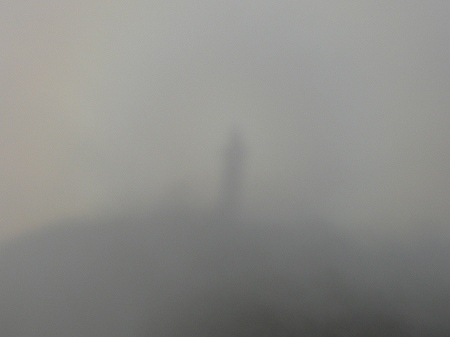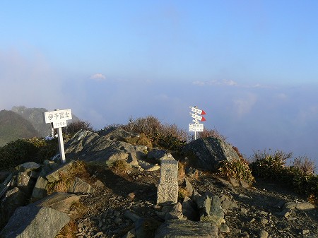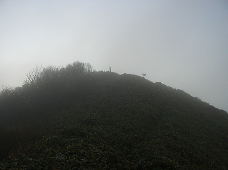 6時10分、山頂に到着したが・・まわりはガスでなにも見ることができない。なんとか晴れてほしいものだが・・・。 |