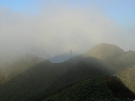 | ブロッケン現象と言うらしい。初めてみた。今から思えば色々ポーズをとってみればよかったかな・・。 |