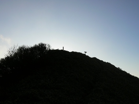 西の方に伊予富士の陰。おおっ!山頂には自分の影が映っている。なんとも神秘的な眺め。 |