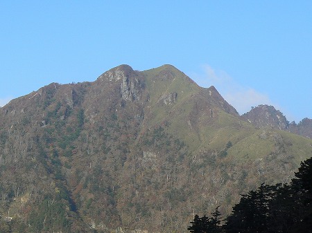 | 瓶ヶ森林道から見上げた伊予富士(1756m)。なんとまあ・・綺麗に晴れたものだ。 |