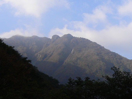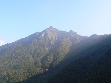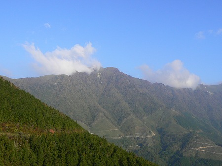 午前8時、旧寒風山トンネルまで戻ってきた。愛媛県側入り口から見た伊予富士(1756m)。あの山頂に登っていたのか・・。 |