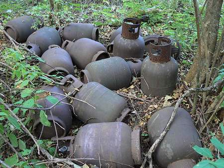 | ガスボンベの山。生活の跡が感じられる。集落の散策は後にして、今日はまず坑口へ向かうことにしよう。 |