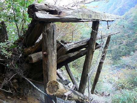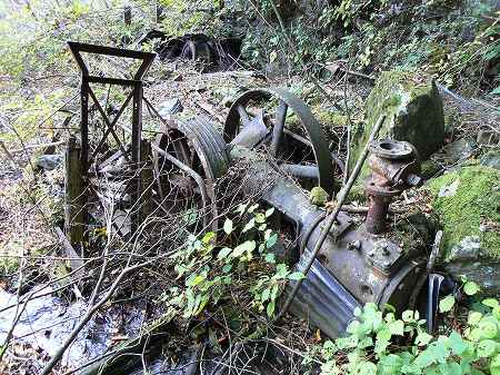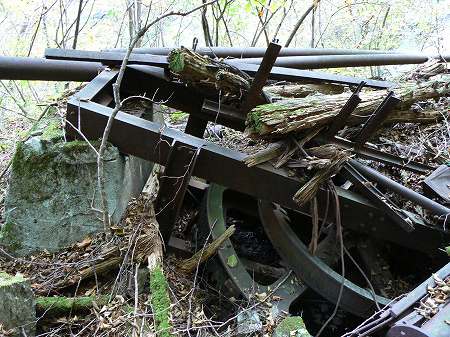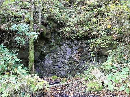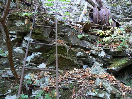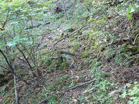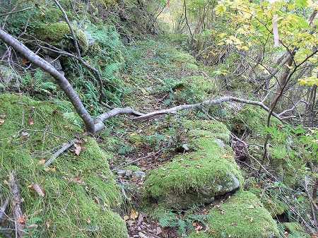 ここから坑口に向かって進む。一応道はあるがこけが生えて歴史を感じる道となっている。 |