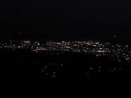 | 朝6時20分登山口に到着した。あたりは真っ暗。西条市街地がはるか下に見える。夜景がとてもきれいだ。 | 夜が明けるのを待ちきれない。午前6時28分、ヘッドランプをつけて登りはじめる。 |