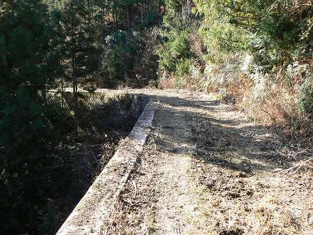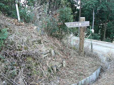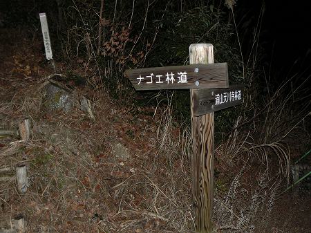| 小走りでどんどん尾根ぞいに下っていると。いつの間にか登ってきた道と違うところを通っているようだが・・。 | 午前9時4分、突然林道に出た。ナゴエ林道だった。いつの間にか尾根を一つ間違えて東の尾根に降りてしまったようだ。 |