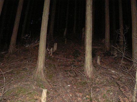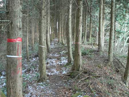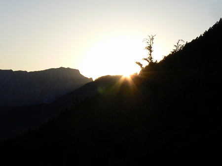 | 植林木の中をどんどん登る。なかなか夜があけない。 | 午前7時過ぎ、ようやくあかるくなってきた。思ったほど寒くなく、大汗をかいてきた。 |