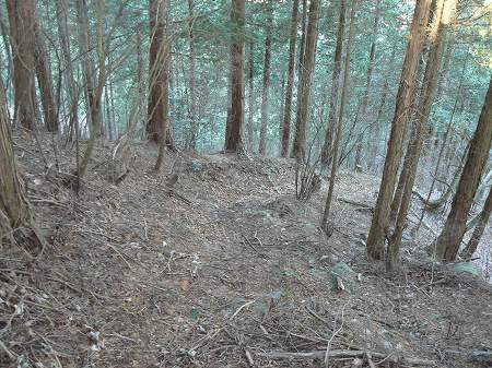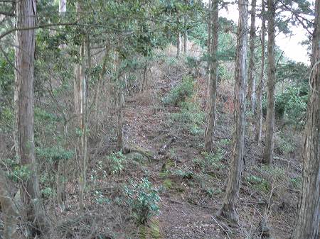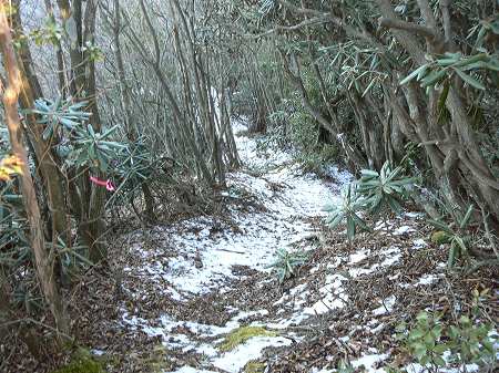 | 大岩をあとに、再び経ヶ嶺山頂へ向かう。さてラストスパートだ。 | 午前7時45分、山頂のすぐ下までやってきた。ここからは一気に山頂までの急坂を上ることになる。 |