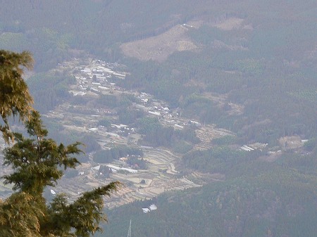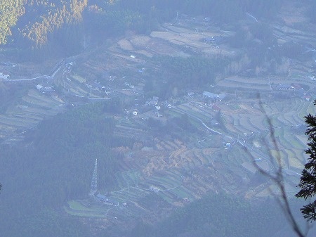 | 下山途中、すぐに黒瀬ダムがはるか下に見えてきた。登りのときは気がつかなかった。 | 千町の棚田もはるか下の方に見えた。こんなに高いところから見るのは初めてだ。 |