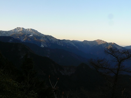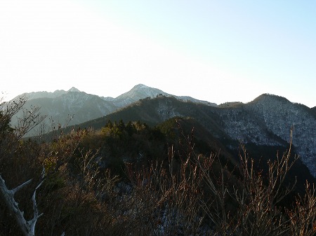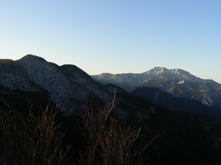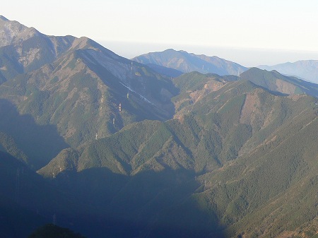 | 大岩から西を見ると、石鎚山からの山並みが見えた。朝日があたってきてとても美しい。 | ずっと北の方に目を向けると、高縄山系の山並が見える。 |