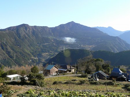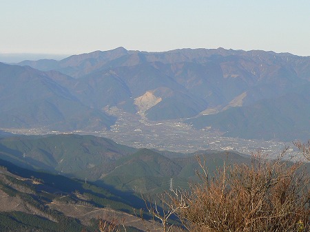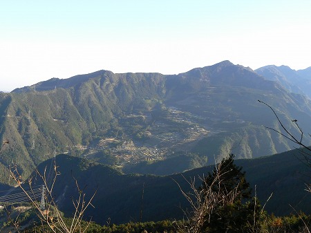 | 東を見ると、黒森山〜沓掛山〜笹ヶ峰〜寒風山へと続く山並み。今日はすばらしく見通しが良い。 | 千町地区も見ることができた。 |