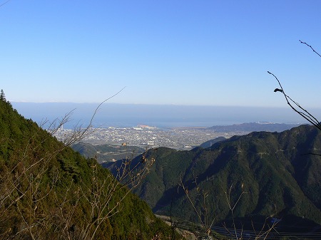 | 山頂からは、高縄山系の山並み、丹原町方面もきれいに見える。 | 山頂は風が強くてとっても寒い。しばらく休んでいたが寒くてたまらないので午前8時28分に下山をはじめる。 |