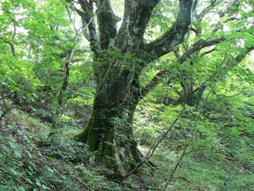 | 獅子舞の鼻の巨大なブナ。ここは次からのお気に入りの場所となりそう。 | ちち山分かれから南を見下ろすと笹の原っぱが続いている。 |