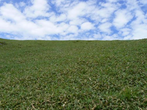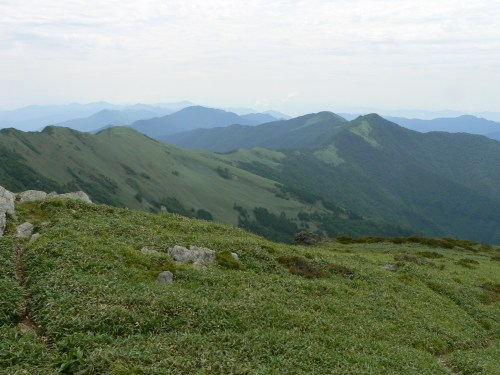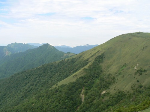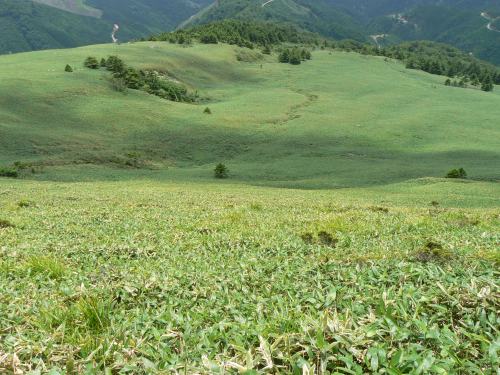 | もみじ谷を過ぎたあたりから笹ヶ峰の方を見上げる。一面の笹原が広がっている。 | ちち山山頂付近から・・・笹ヶ峰〜寒風山〜伊予富士へと続く山並み。 |