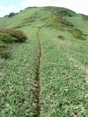 | 笹ヶ峰山頂付近から・・ちち山〜冠山〜平家平へと続く山並み。 | 笹ヶ峰山頂への道。この稜線の笹原の中のまっすぐな道がとても気に入っている。 |